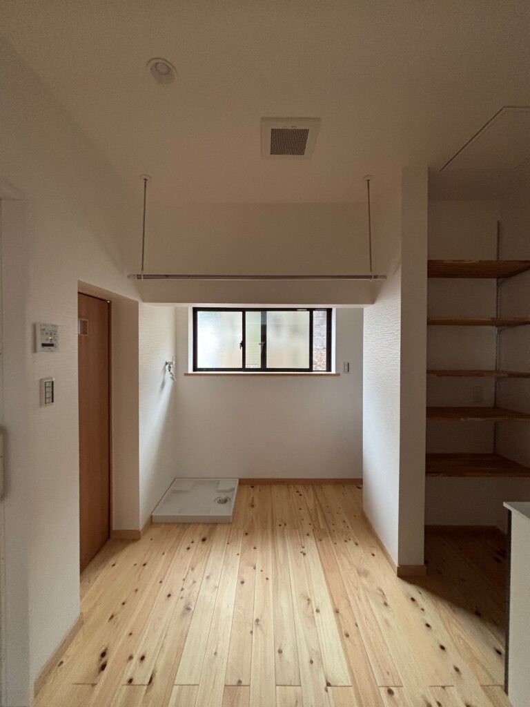 洗面脱衣室の様子です。フローリングはヒノキを貼っており、クロスも白くし、明るい空間となっております。