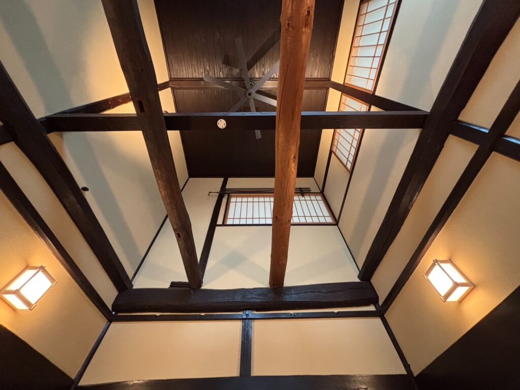 吹抜けには昔から飾っておられた、薙刀をかけなおし、天井にはシーリングファンを設置しました。