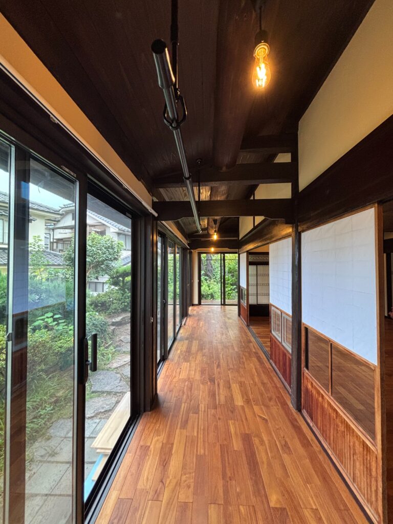 縁側の様子です。元々幅広い縁側でしたが、お施主様の希望で、天井も丸太梁をみせ、