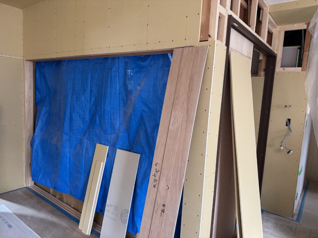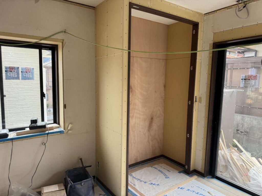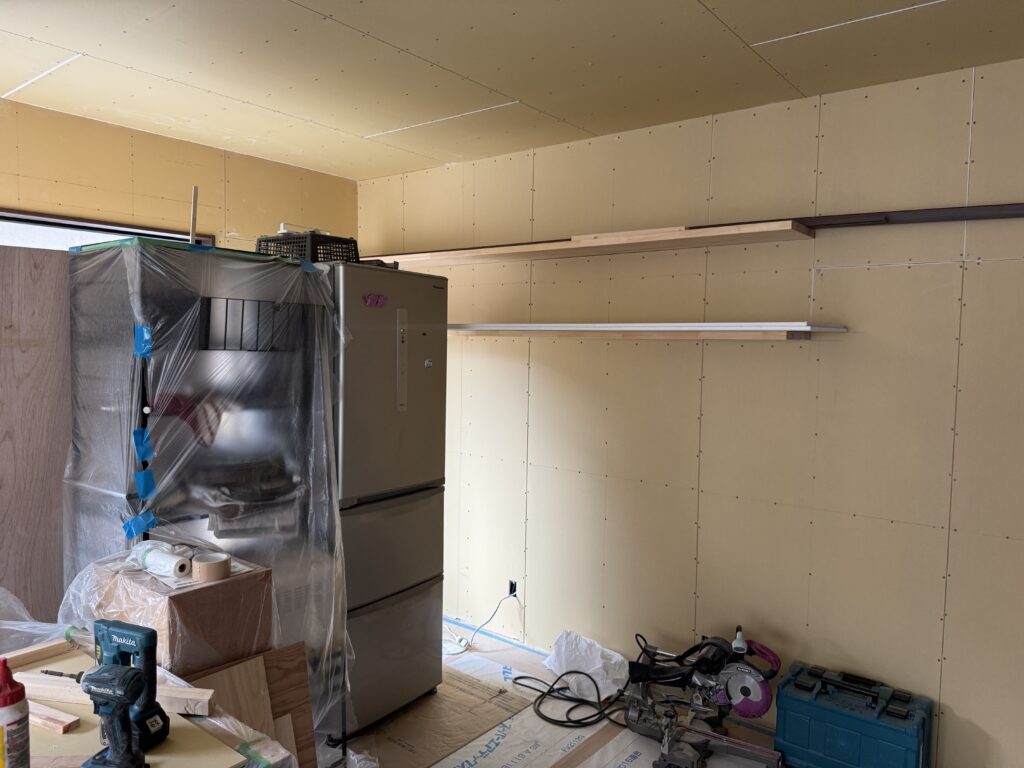 大工工事も終盤に差し掛かり、室内のボード張りを行っています。