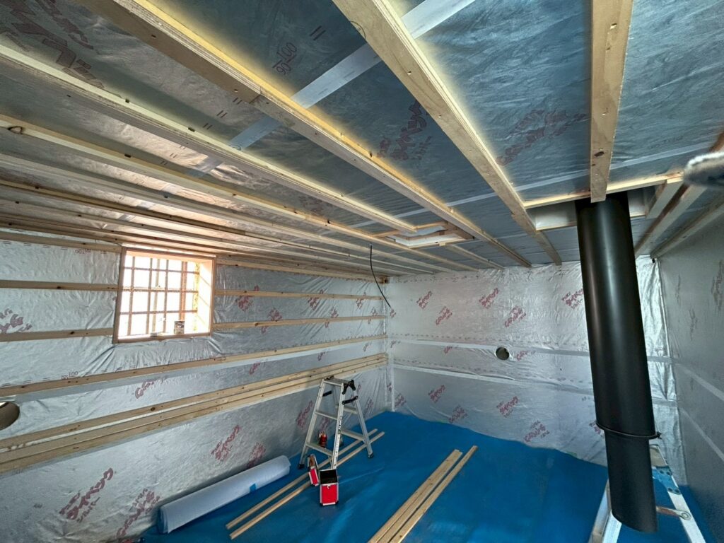 お施主様のご要望で天井は勾配をつけるように胴縁を二重張りしている箇所があります。