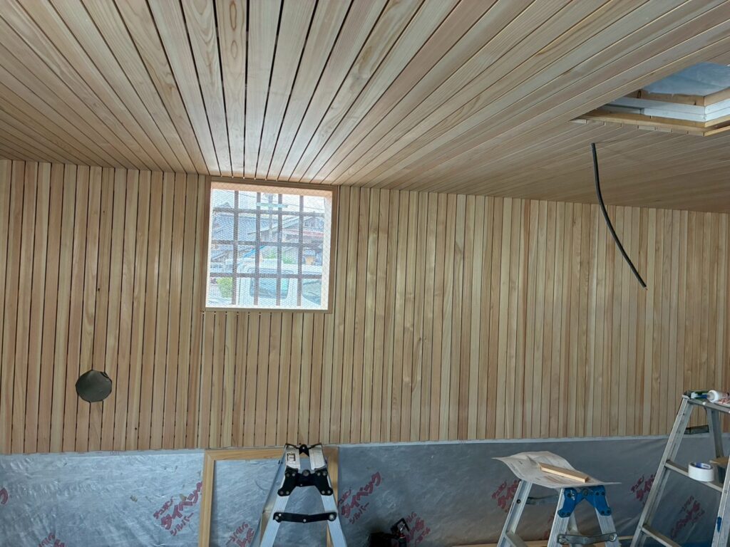 天井と壁面の仕上げは桧材を使用しております。お施主様のご要望で、幅は細長いものにしました。板と板は空気の流れを確保するので、5mmほど間を空けております!