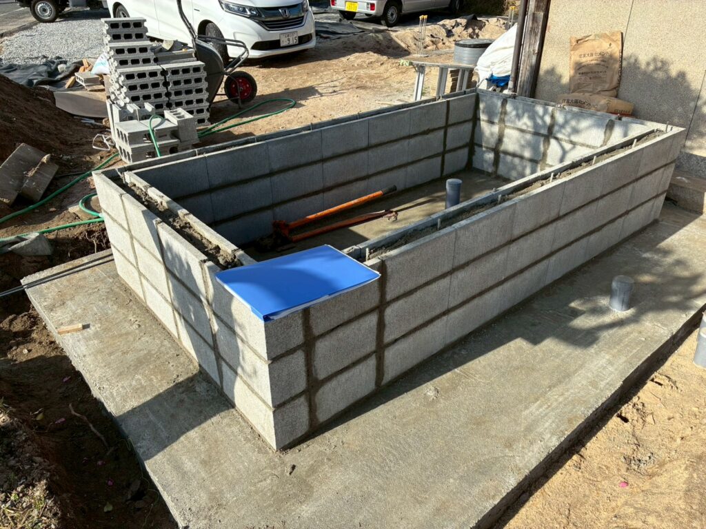 外部水風呂も枠ができました!ここから防水工事などを行っていきます!