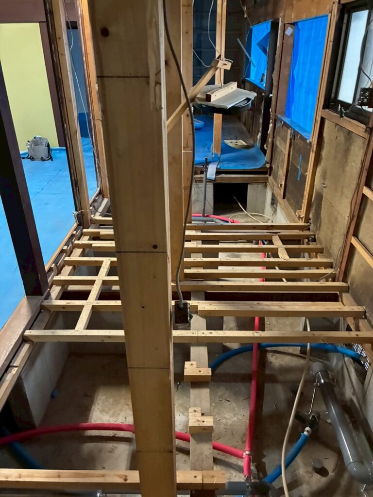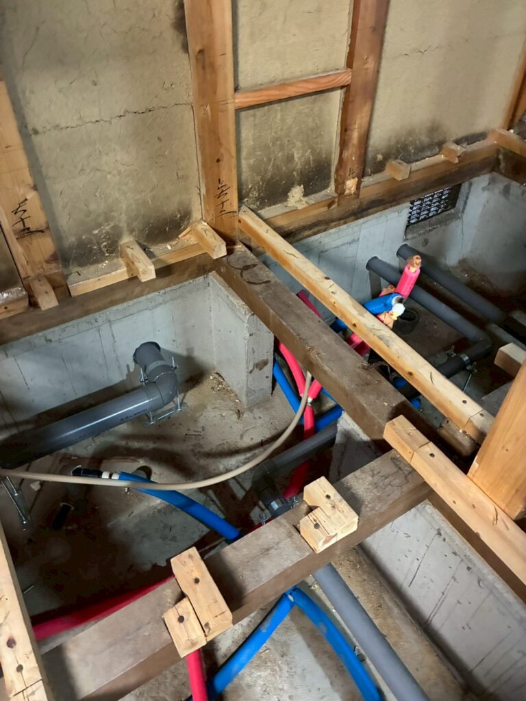 今回の建物は基礎や床組みがしっかりとしている建物だったので、解体後すぐに配管仕込み作業をしました!