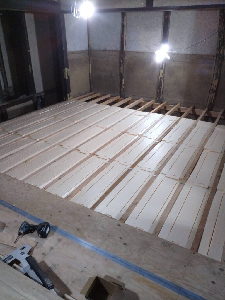 先程断熱材を入れていた縁側部分です。ボードを張った後です。