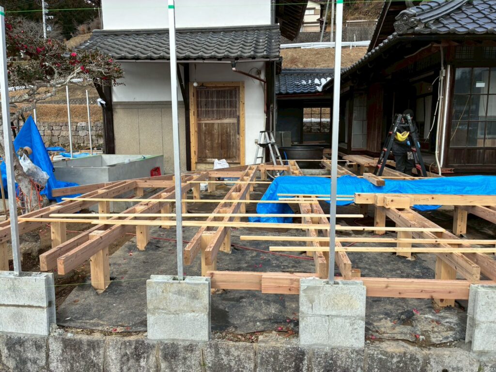 お施主様の施工になりますが、蔵のサウナと母屋の縁側を繋げるウッドデッキも現在造作されております。年末年始休まず、施工されていたようでOPENに向けて気合が伝わってきました。