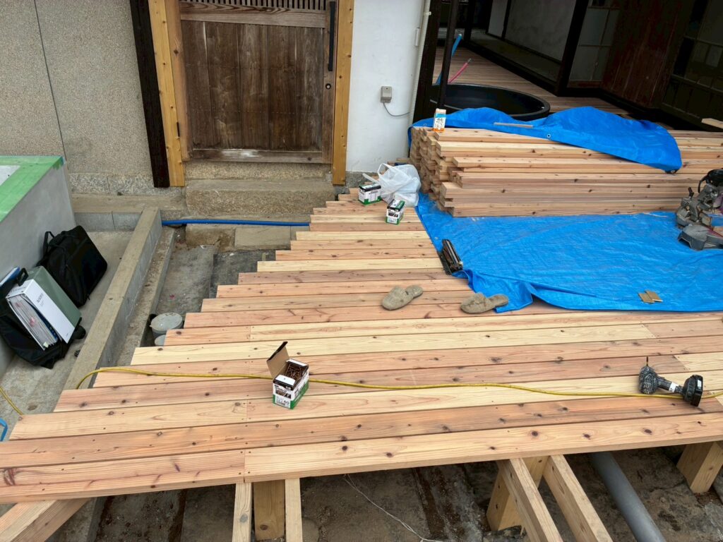 お施主様側もウッドデッキの造作工事頑張っております!