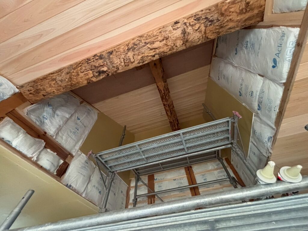 吹き抜けの天井部も板張りを行っております!
