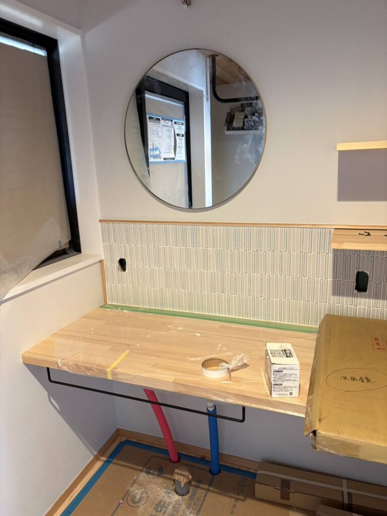 水回り周辺も左官塗り仕上げ、やクロス、タイル仕上げを今週行い、関連するタオルバーや鏡なども取付をし、大工工事は完了致しました!