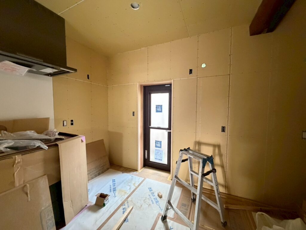 〈キッチン部分のボード貼り〉