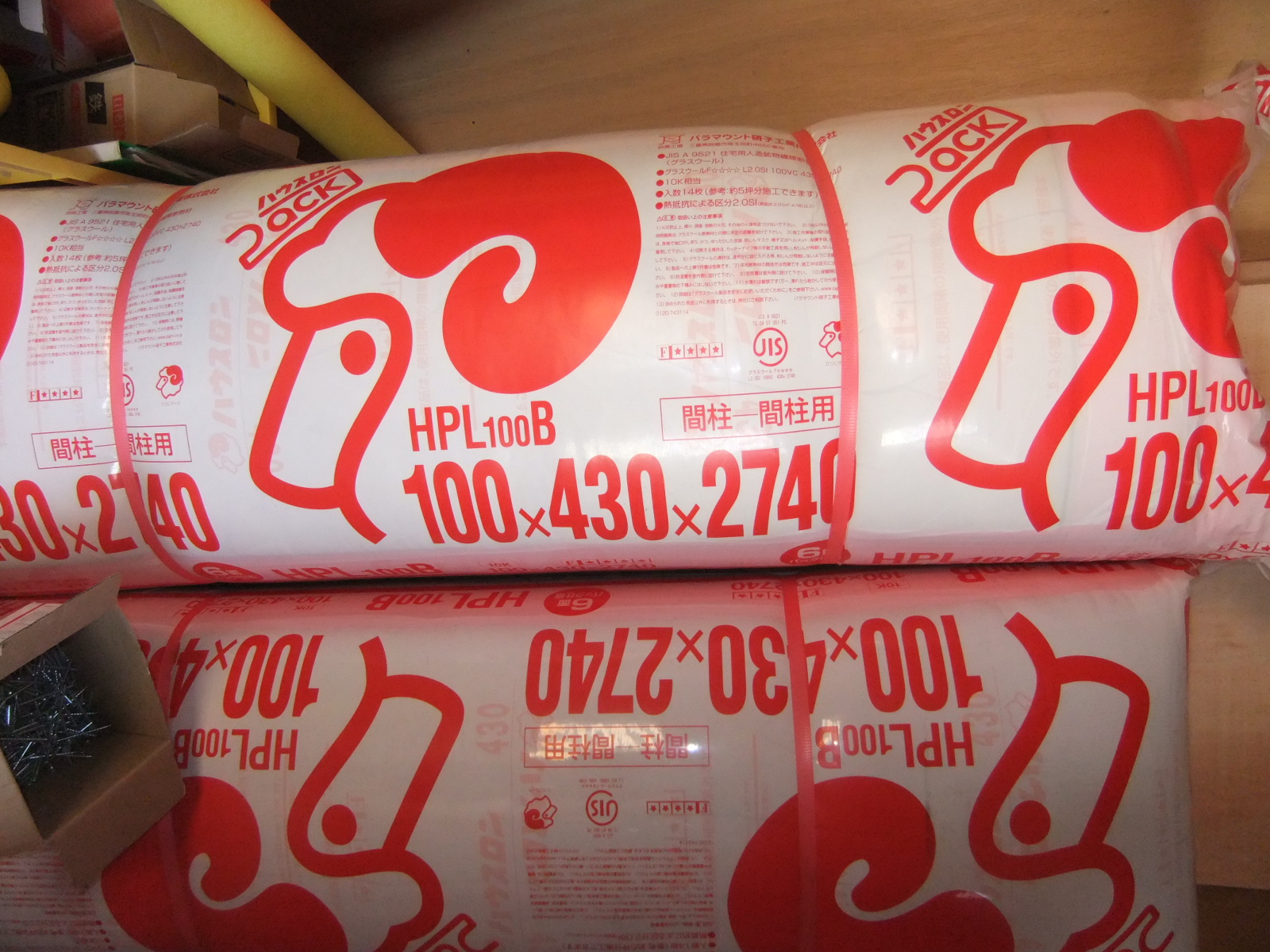 これはグラスウールと呼ばれている断熱材です。弊社では天井裏に100mm厚のものを敷き込んでいます。(この1袋に14枚も入っているんです)