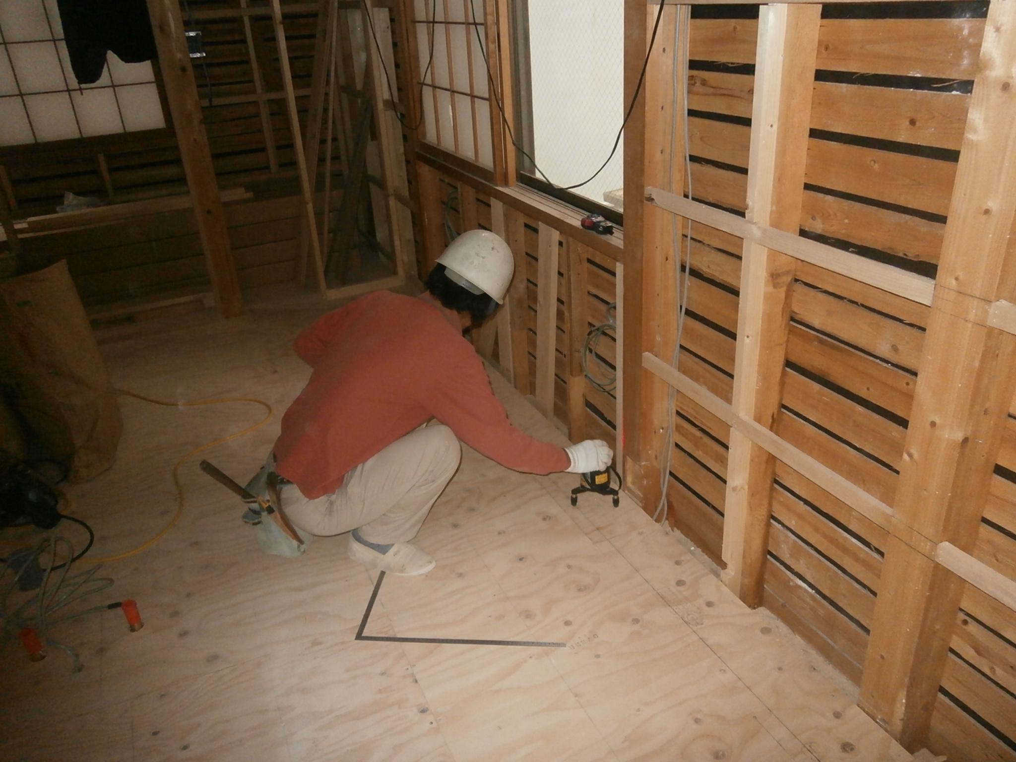 床下地貼りが完了し、再度レベルチェックを行い次はフローリングの張り込みです。