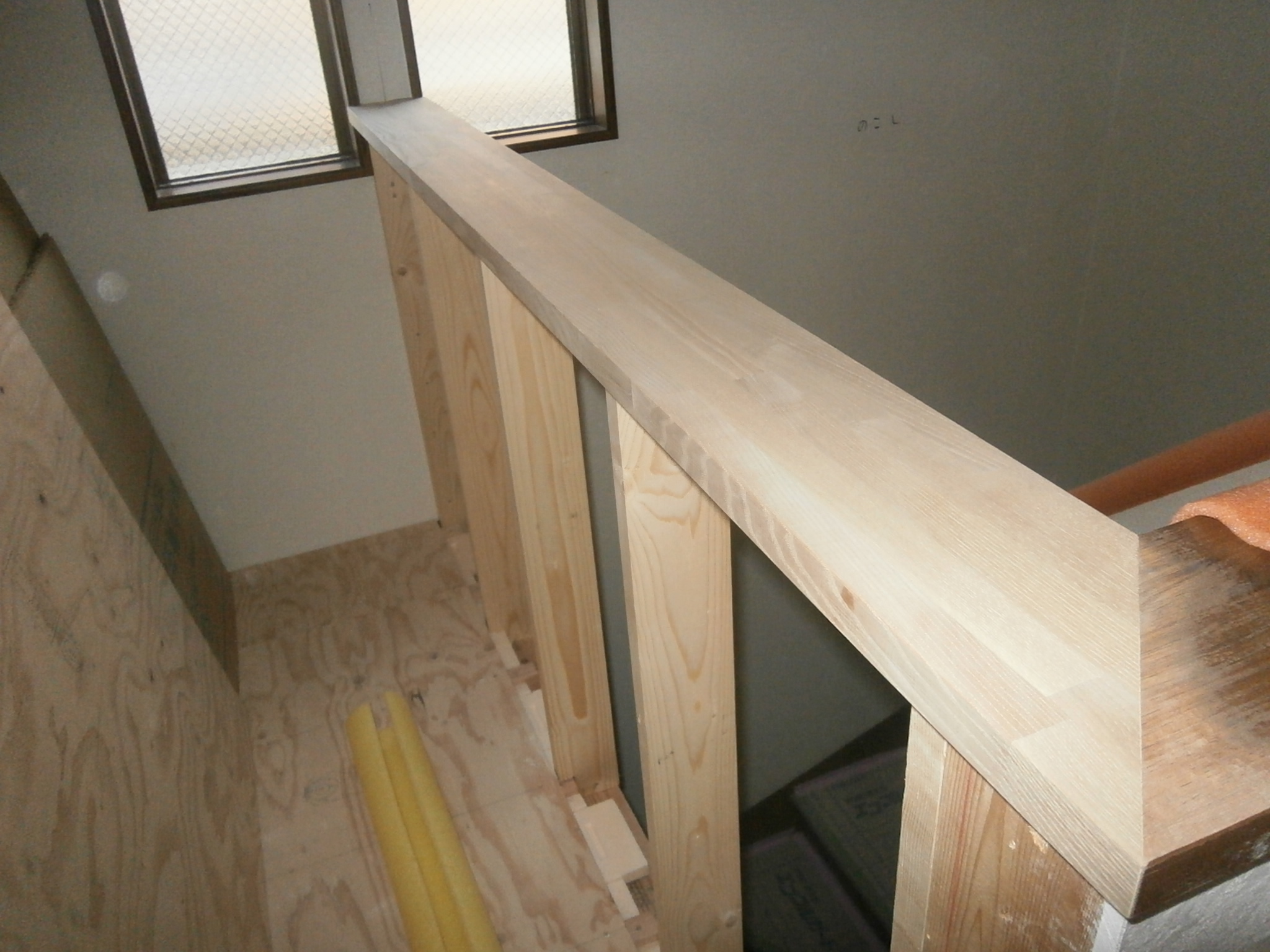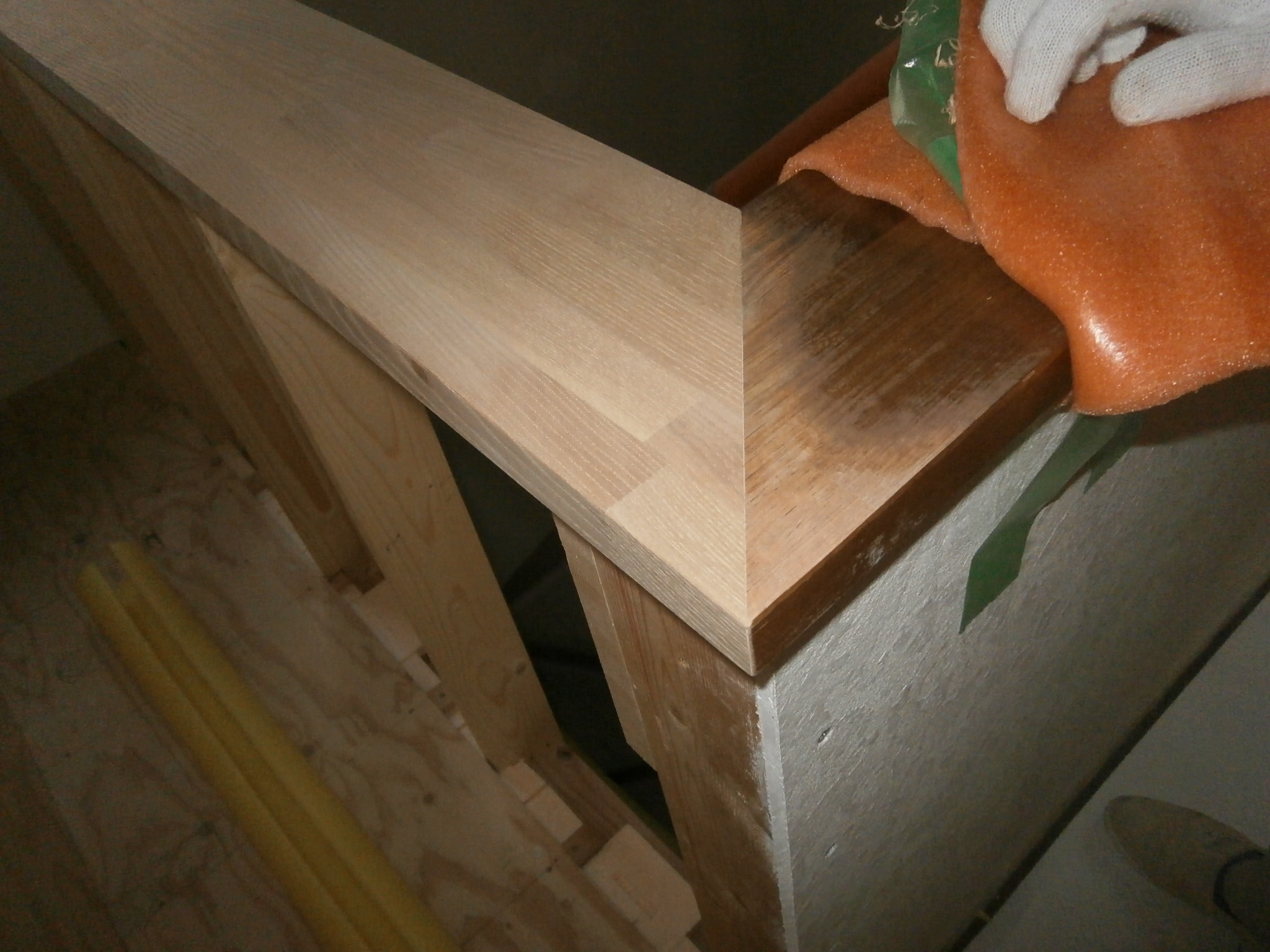 これは新しく手摺を作っている処です。材料はタモという木材で右の在来手摺と90度曲げています。