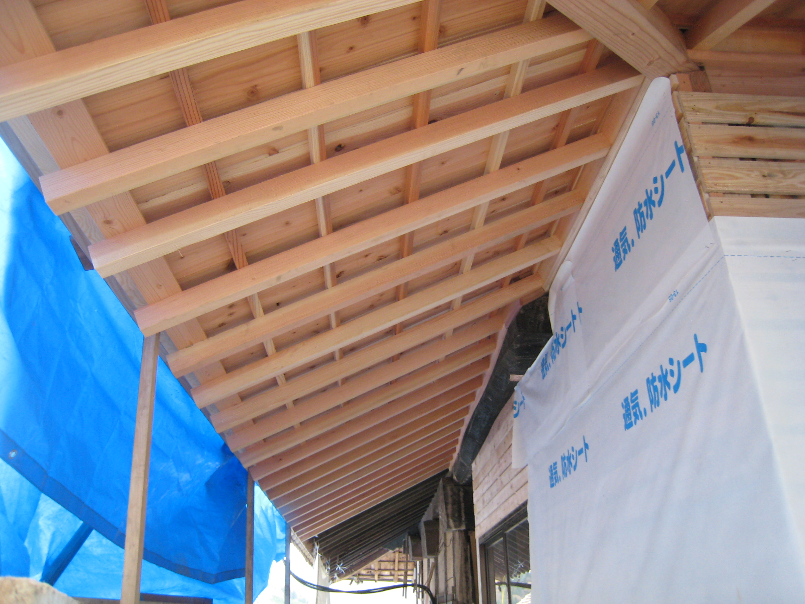 減築したことで外壁や屋根は新たに造り替えることになりました。 今は雨や雪の対策としてブルーシートで覆ってあるので、 軒裏からみたところの写真です。