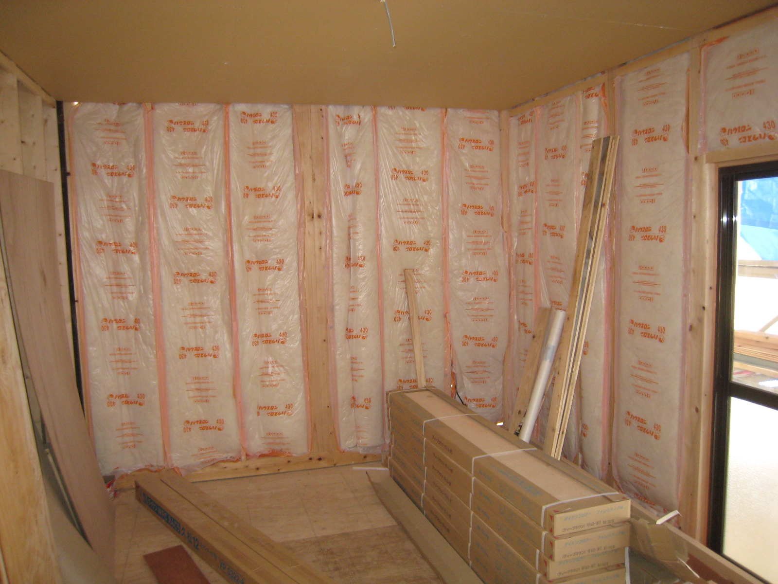 外壁側も断熱材を入れて、すでに石膏ボードも張ってある状況で、 台所だったところが、洋室に変わります。