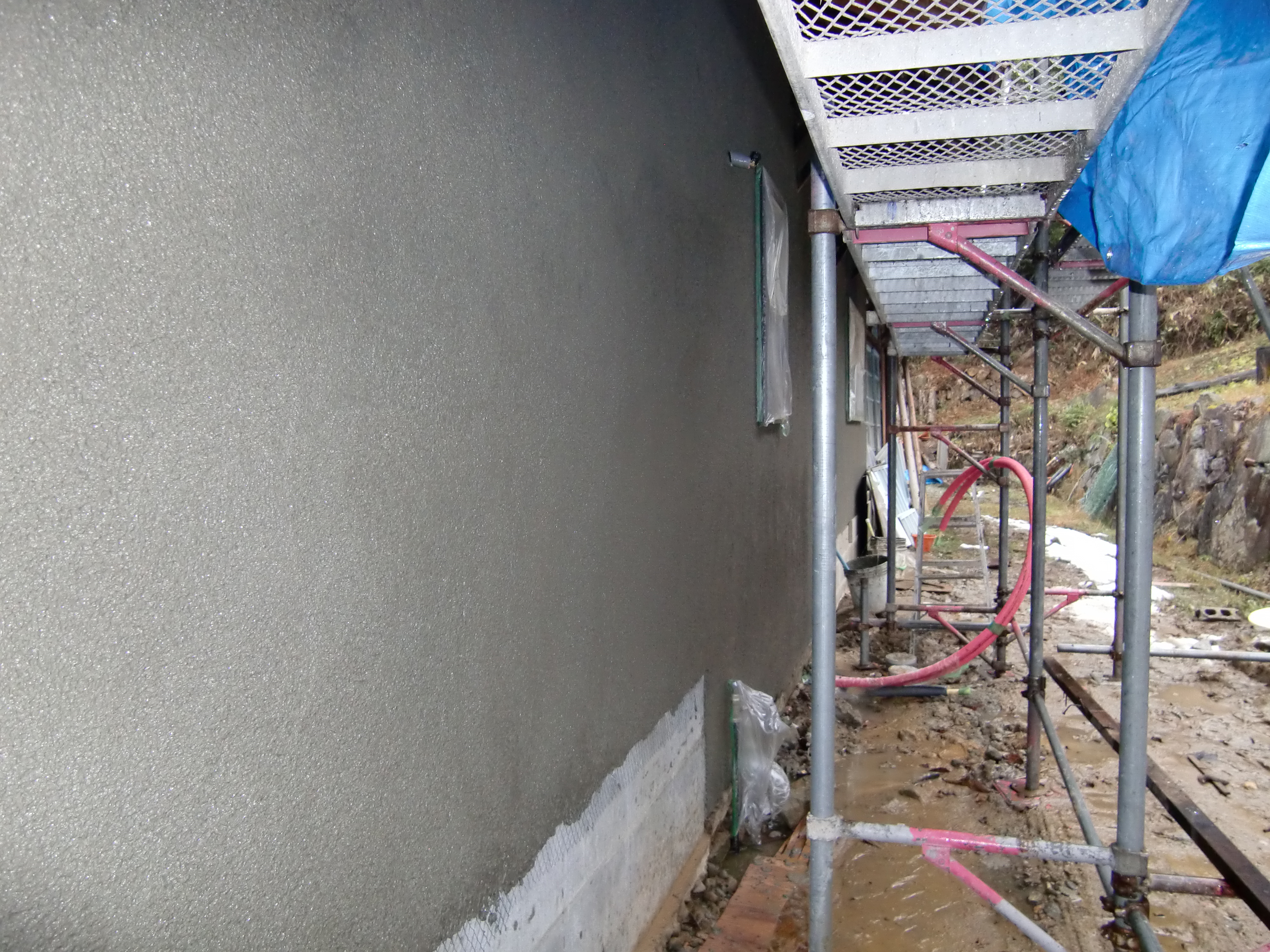 外壁はモルタルの下塗りまで終わらせてあるので、 あとは仕上げて、吹付けを残すのみです。