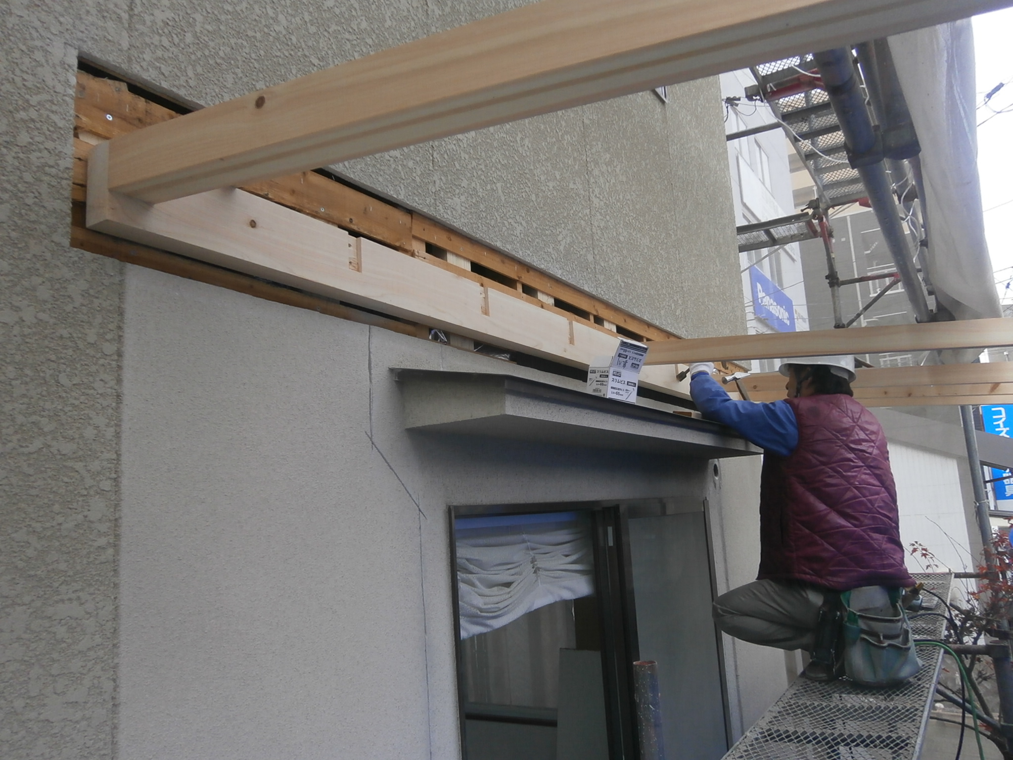 写真上が店舗出入口庇を組立中で、モルタル壁に切込みを入れ後に板金葺きをする際に壁内に埋め込む事で雨水漏れを防ぎます。