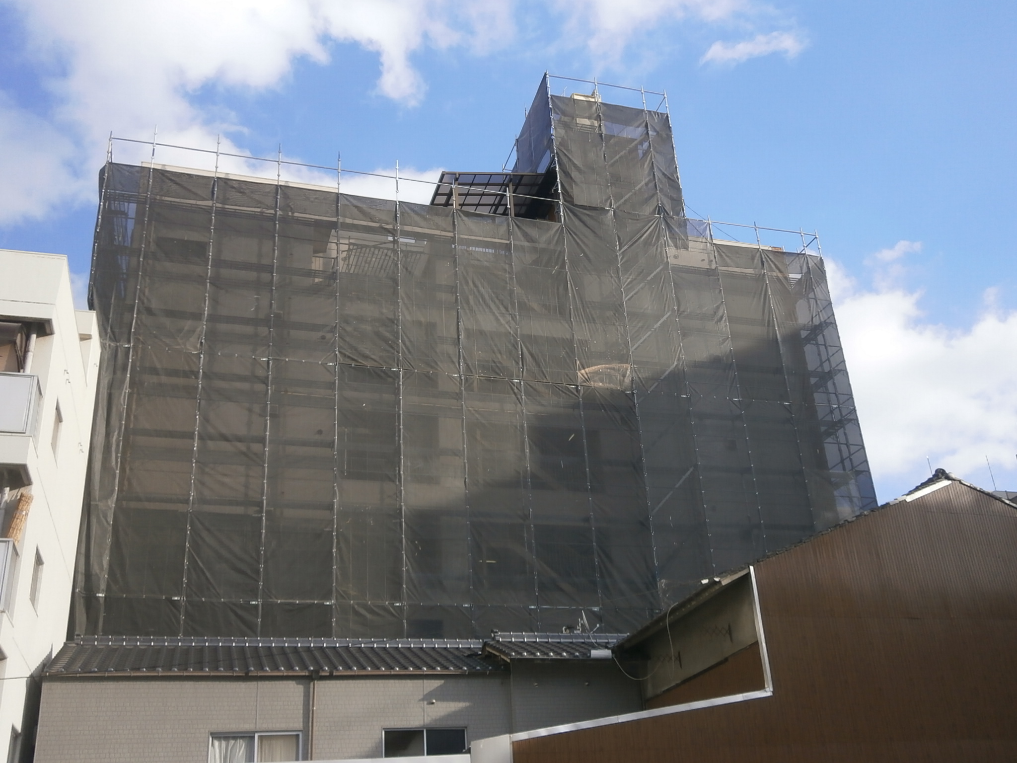 まずは足場組立から。飛散防止ネットを貼ります。