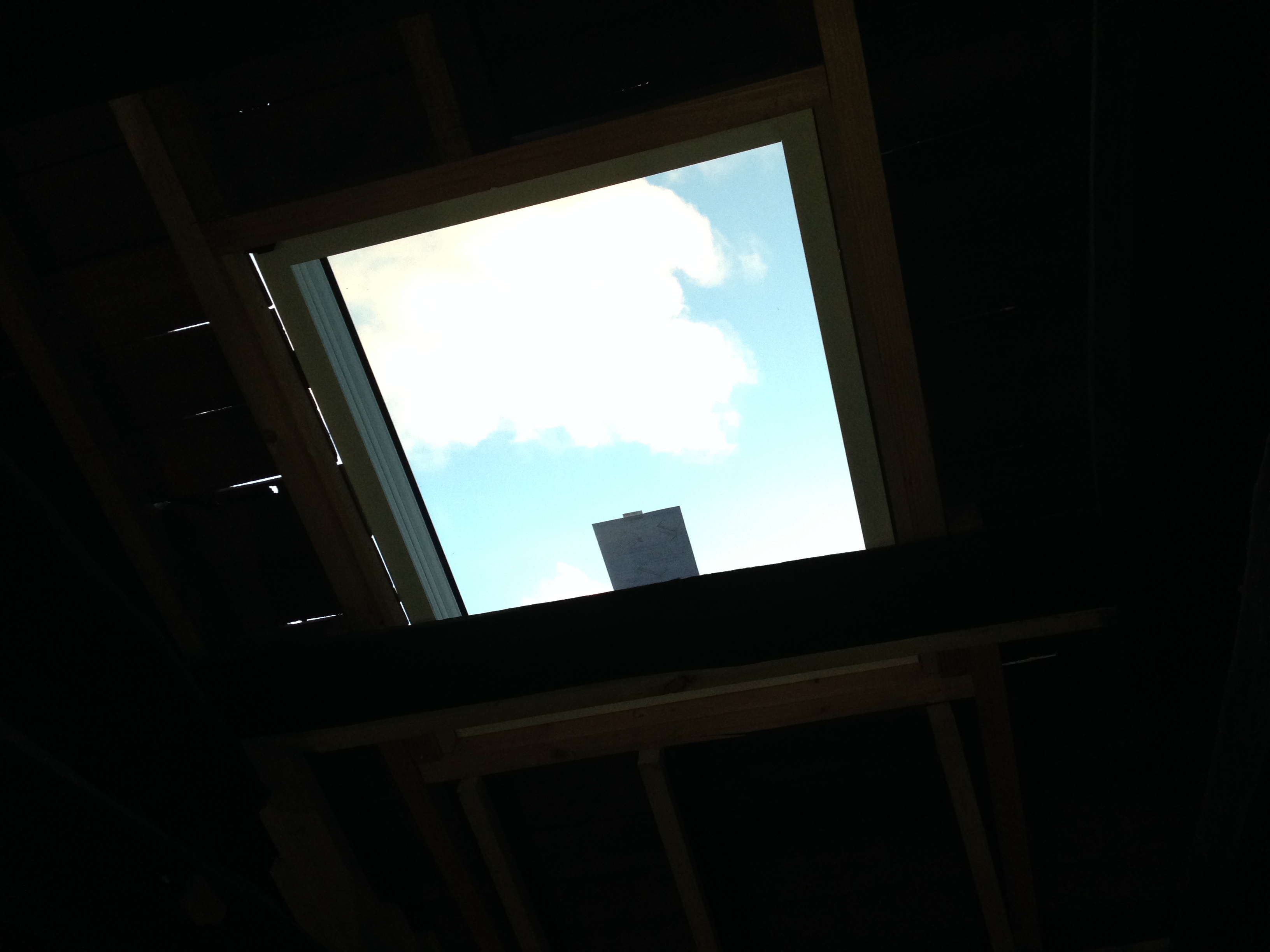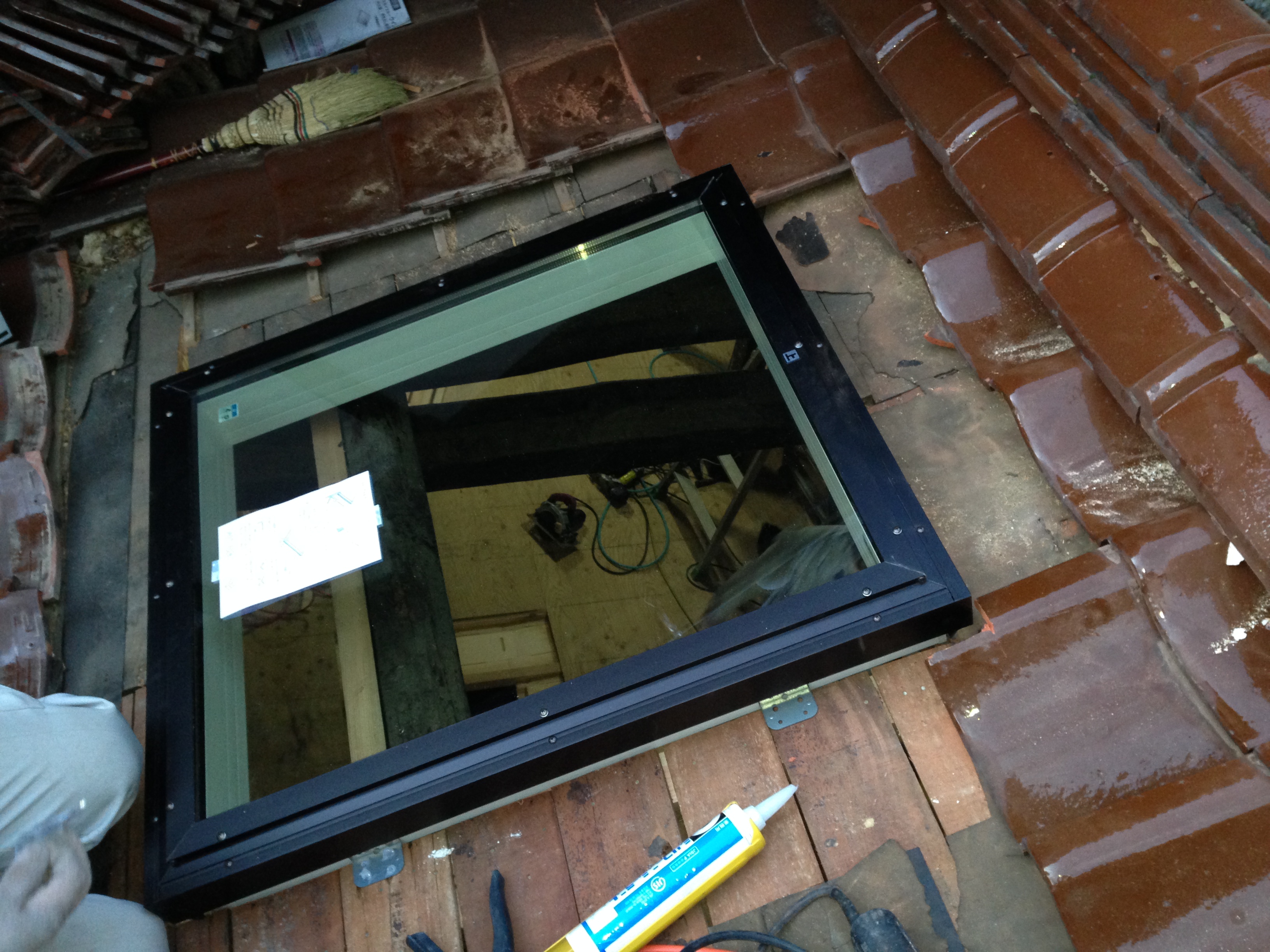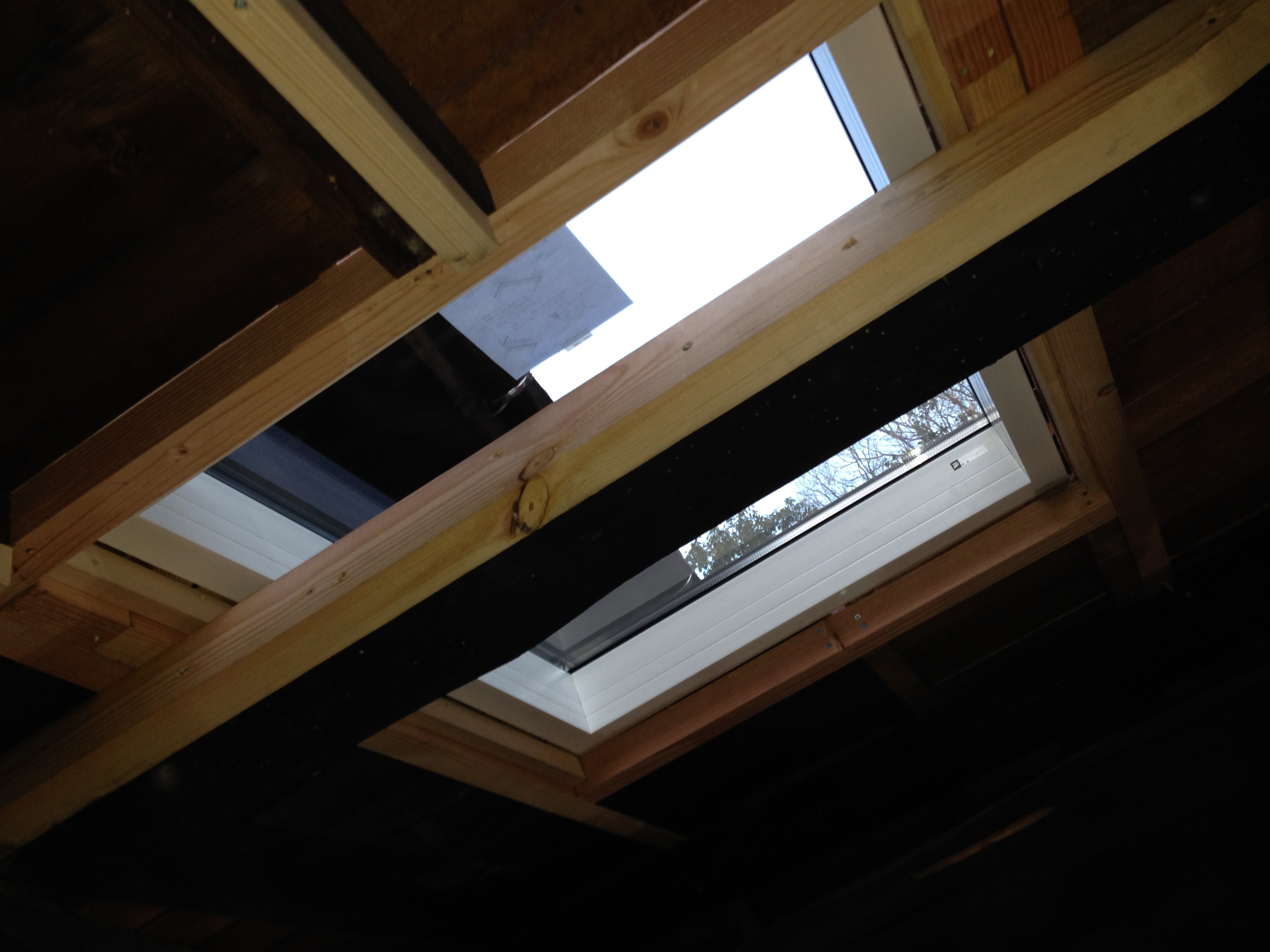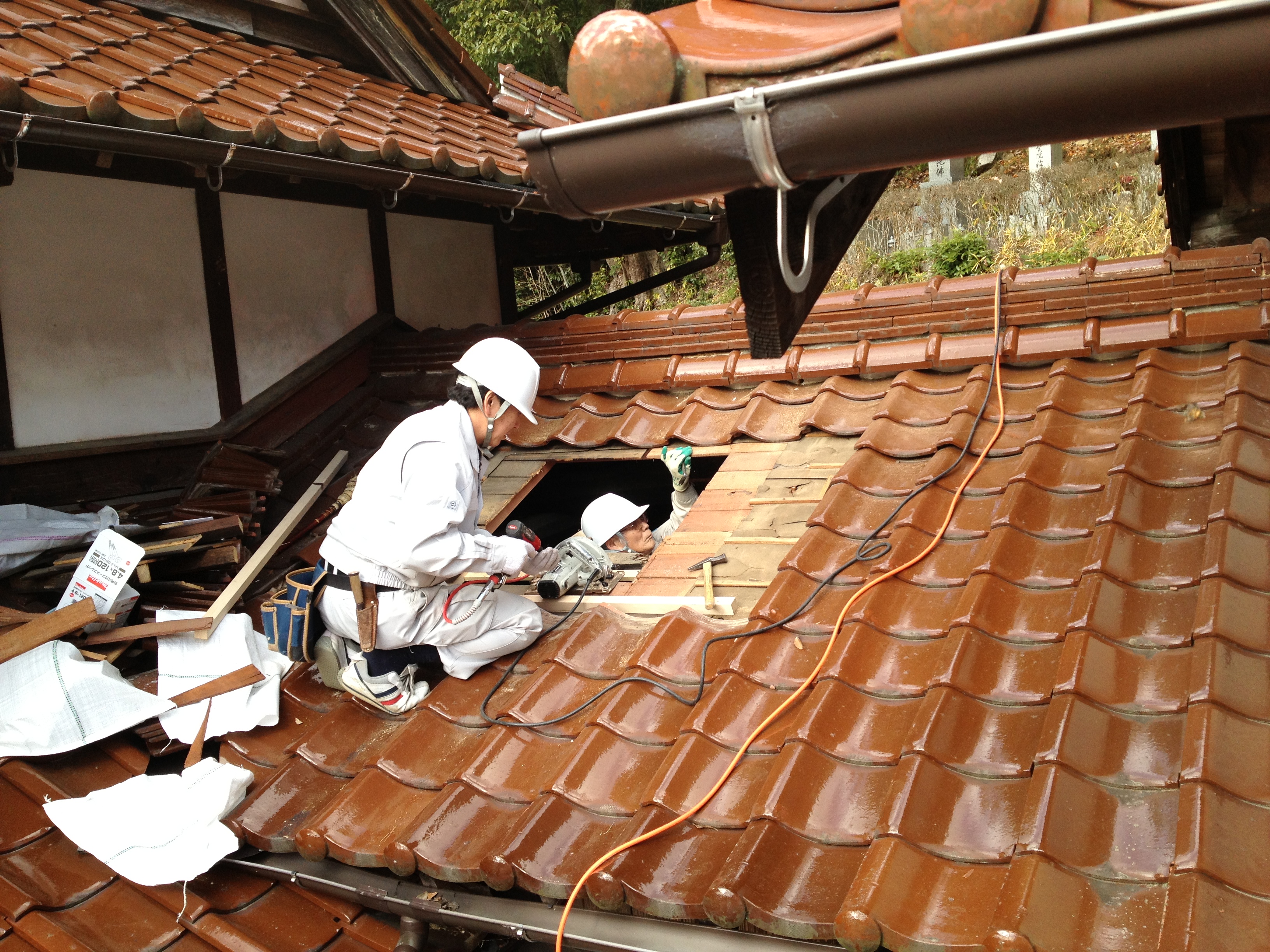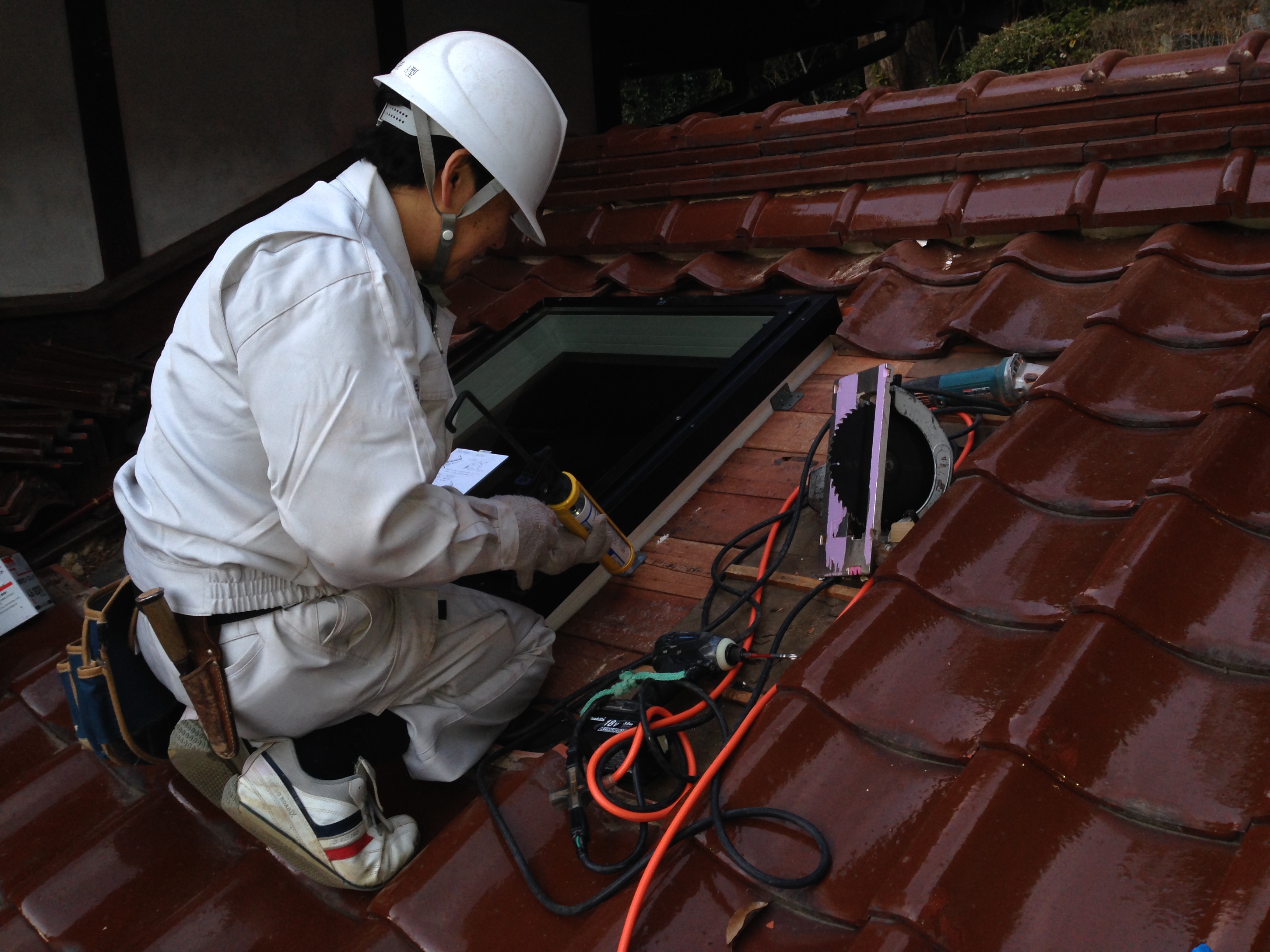 部分的に瓦を撤去し、サッシ寸法に合わせて開口、そして木下地を造ります。