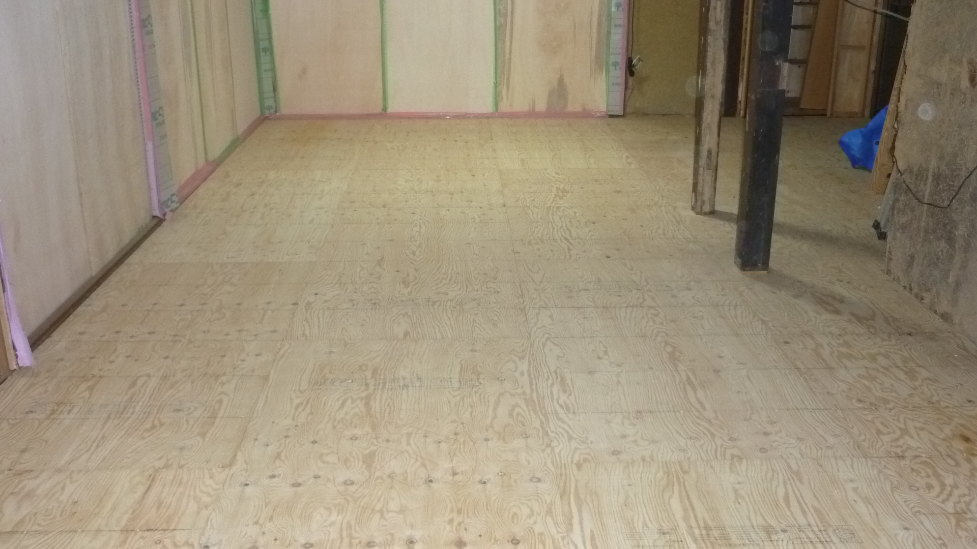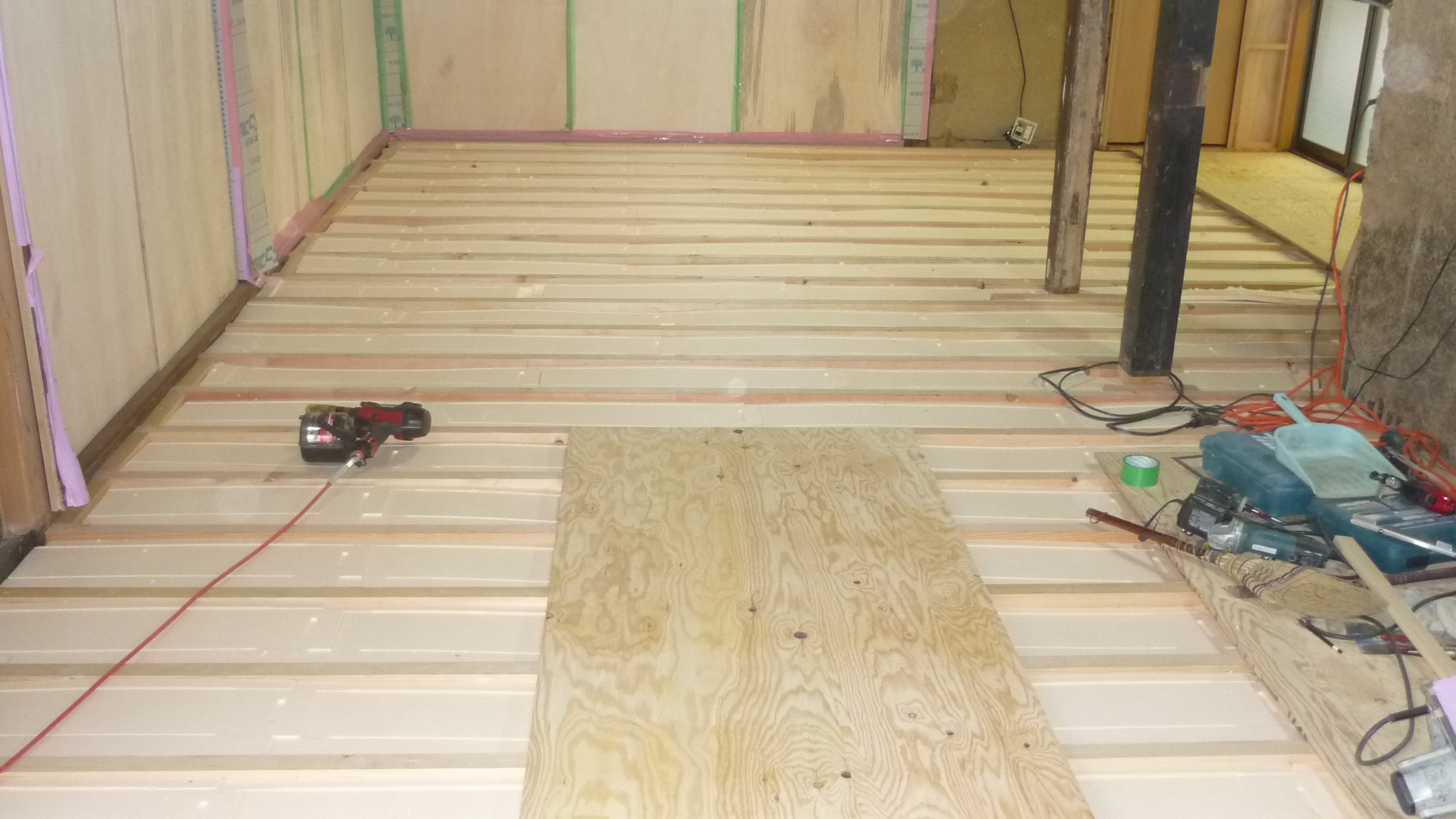 続いて、床に構造用合板を貼ることで、強度向上と共にフローリングの下地を造っていきます。